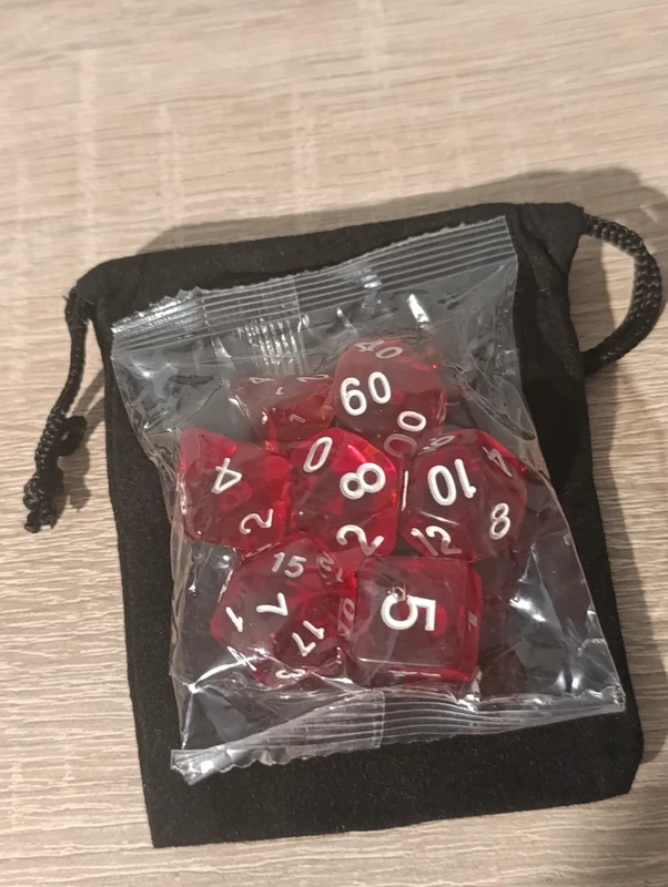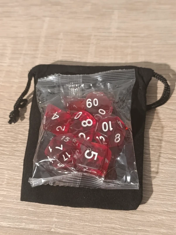 - Kształt: zestaw wielościanów RPG (D4–D20)